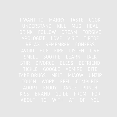 i want to marry taste cook understand kill mug heal drink follow dream forgive apologize love visit tiptoe relax remember confess avoid hug fire listen live smell soothe learn talk stir divorce bless befriend tickle google admire bite take drugs melt miaow unzip touch work feel complete adopt enjoy dance punch kiss brand guide from For About To with At of You